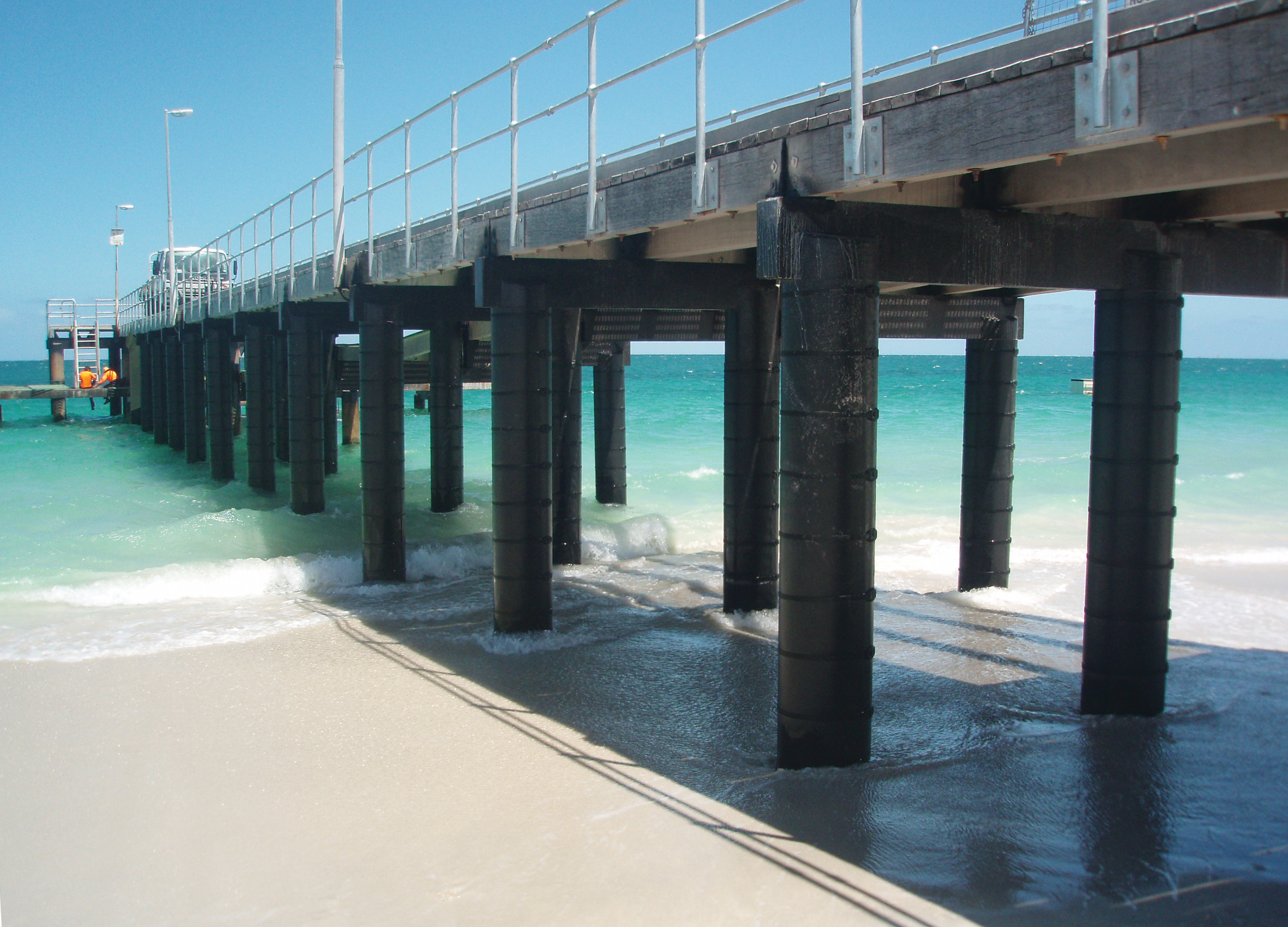 The protection of shore based structures in the immersed, atmospheric and splash zones. Pile materials of steel, timber and concrete and piles of round, square, hexagonal and H sections can all be accommodated. Protection can also be offered for cross bracings, pipework and other parts of the structure